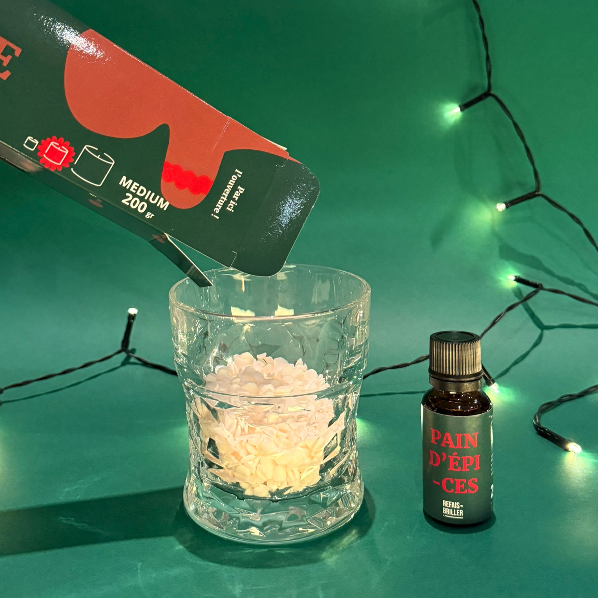Dans le kit, vous trouverez de quoi confectionner une bougie Pain d'épice au parfum :